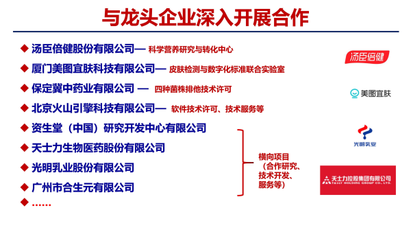 研究所进一步加强高质量科研成果转化,构建基础研究与应用基础研究“双循环”发展格局。在产业合作方面,研究所以应用基础研究为抓手,通过引入行业龙头企业,合力突破产业发展赛道中的关键技术制约,提升科技成果转化的工程化能力,加快转化转移、促进产业经济发展。包括:与汤臣倍健股份有限公司共建“科学营养研究与转化中心”;与厦门美图宜肤科技有限公司共同设立“皮肤检测与数字化标准实验中心”;与保定冀中药业有限公司实现真菌毒素降解酶技术转让;与上海中科新生命生物科技有限公司建立“多组学技术开发与转化中心”项目合作;成为商务部长三角产业安全监测工作站依托单位;接受上海市商委指定,作为政府第三方建立“上海产业安全监测与预警研究中心”;与北京火山引擎科技有限公司、资生堂(中国)研究开发中心有限公司、天士力生物医药股份有限公司、光明乳业股份有限公司、广州市合生元有限公司等企业深入开展横向项目合作。