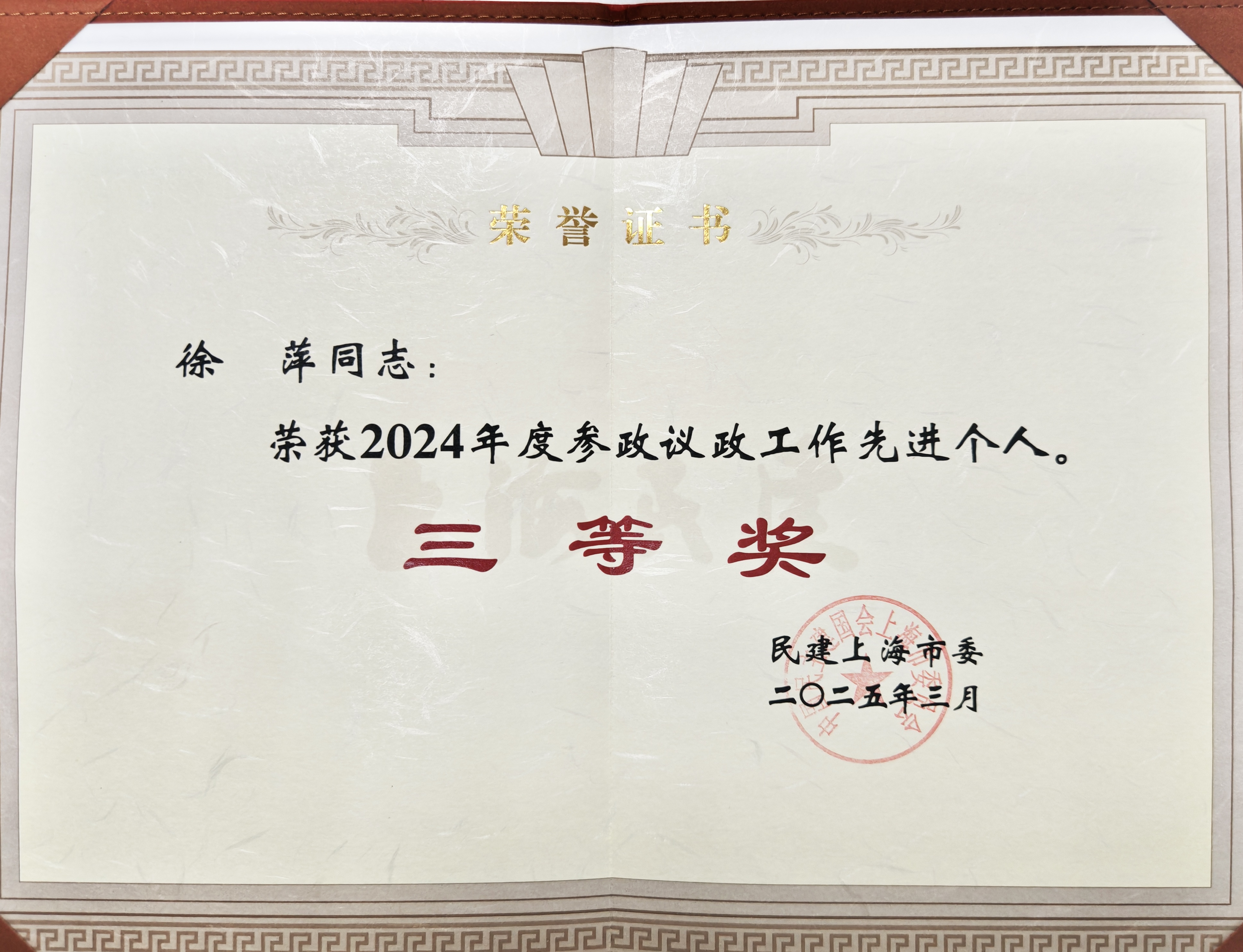 近日,民建上海市委召开十四届十五次常委(扩大)会议,会上宣布了民建上海市委的表彰决定。民建会员、中国科学院上海营养与健康研究所徐萍研究馆员荣获民建上海市委“2024年度参政议政工作先进个人”三等奖。