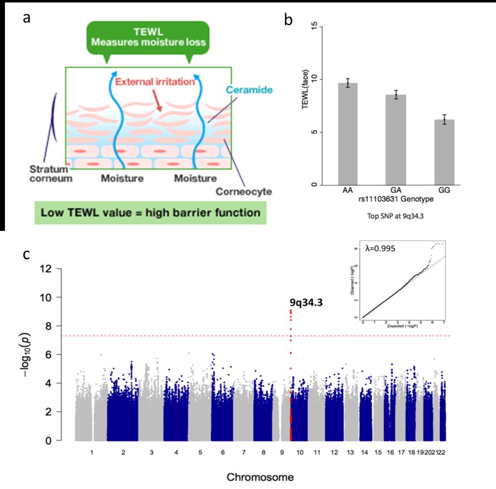 2016年12月21日,皮肤学顶级杂志Journal of Investigative Dermatology在线发表了中国科学院-马普学会计算生物学伙伴研究所汪思佳研究组题为:“A genome-wide association study of basal transepidermal water loss (TEWL) finds variants at 9q34.3 to be associated with skin barrier function”的研究成果。经皮失水率(TEWL),指透过表皮丢失的水分量,是评价皮肤屏障功能的重要指标之一。该研究首次针对汉族健康人群的皮肤屏障功能,利用基础经皮失水率值进行全基因组关联分析,发现位于9号染色体9q34.3处的基因位点突变与TEWL密切相关,揭示影响东亚汉族群体皮肤屏障功能的遗传因素。