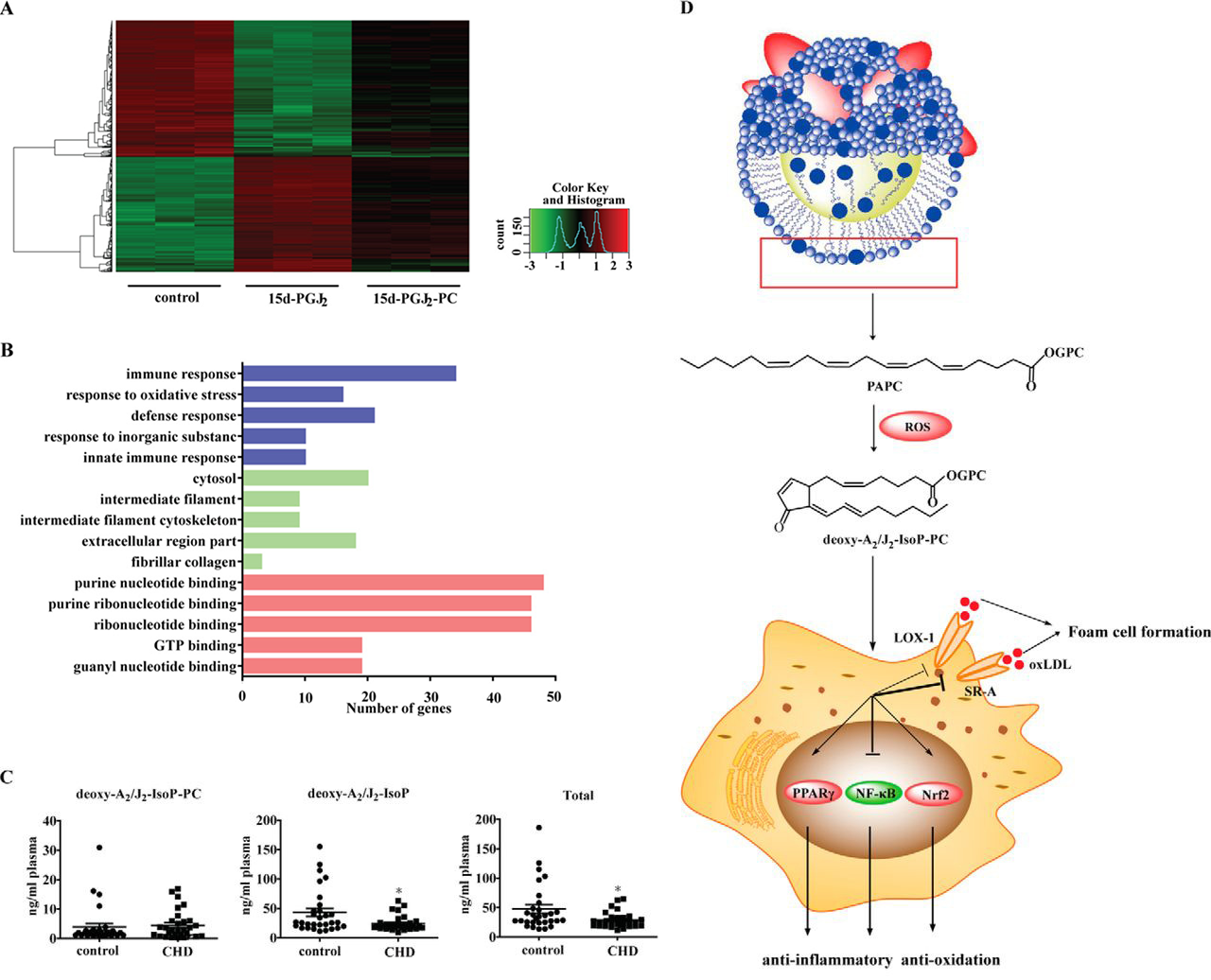 (A)转录组学发现这类氧化产物和前列腺素15d-PGJ2影响不同基因表达。(B)氧化应激和炎症响应是该氧化产物影响的主要途径。(C)在心血管病人血浆中这类氧化产物水平降低,提示可能具有?;ぷ饔?。(D)这氧化产物的形成和可能的作用机制。