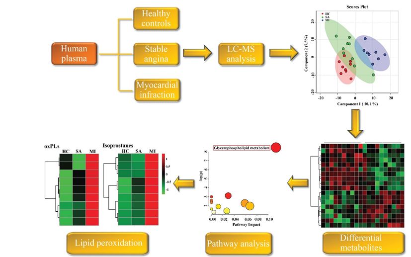 图:利用代谢组学、脂质组学研究不同阶段冠心病病人血浆代谢变化的流程图。