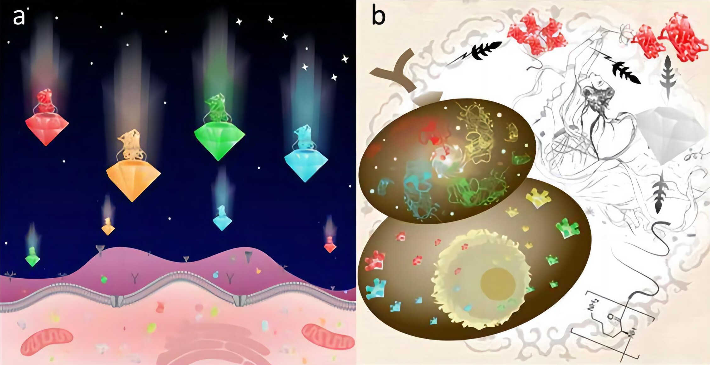 a.纳米金刚石运输蛋白质穿过细胞屏障的能力堪比空间宝石;b.多聚赖氨酸缠绕的纳米金刚石,让人想到敦煌壁画中飞天仙女的装束。