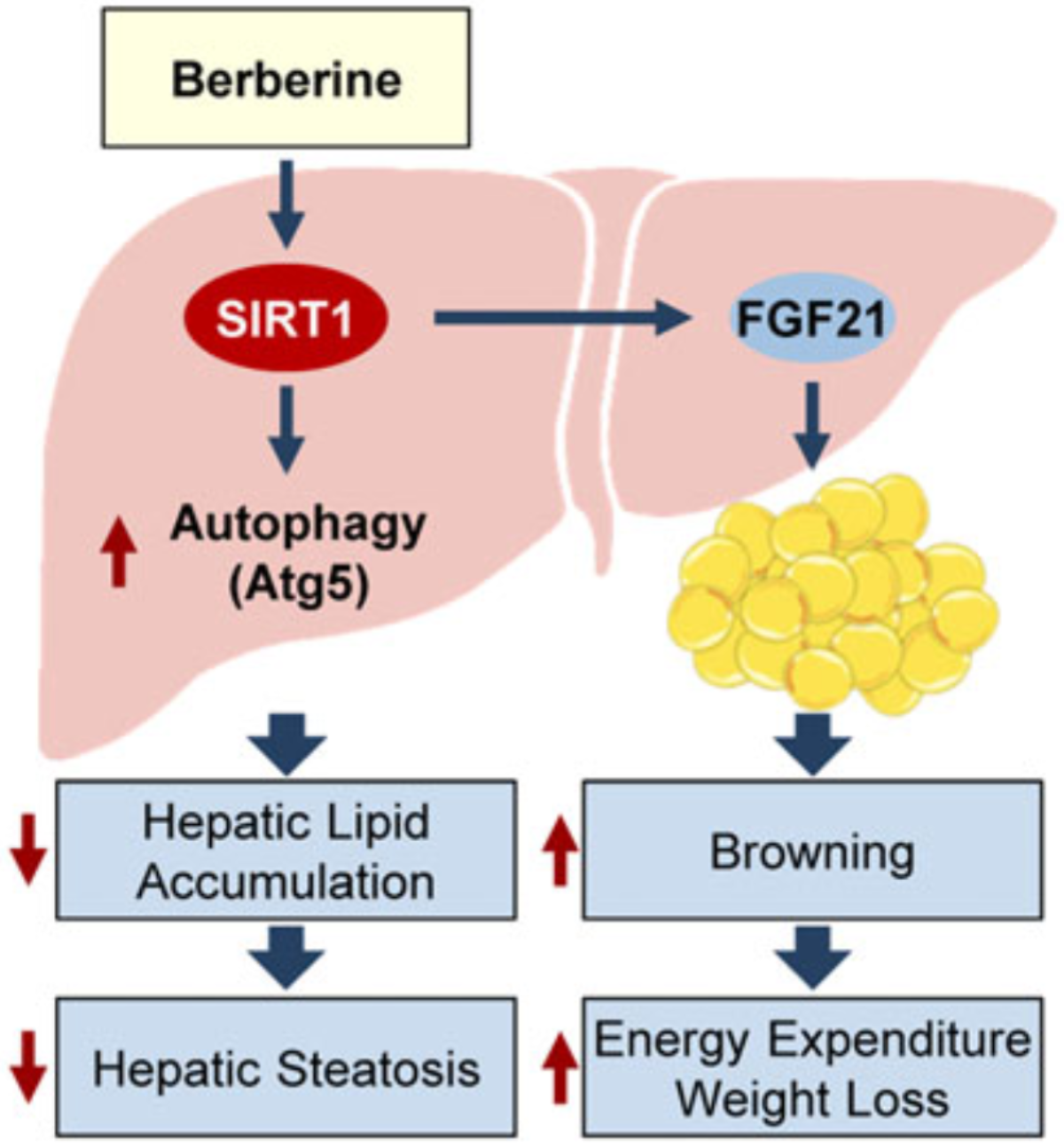 李于研究组与复旦大学中山医院高鑫研究组通力合作,其博士生孙艺璇等人通过深入的体内和体外研究发现,小檗碱可有效增强肝细胞中的自噬水平,明显改善高脂高蔗糖饮食(high-fat high-sucrose diet, HFHS)诱导下肝脏脂质变程度。进一步的研究发现,小檗碱诱导肝细胞自噬的作用一定程度上介导了该药物抑制肝脂沉积作用的发挥。而在SIRT1肝脏特异性敲除(SIRT1 liver specific knockout, SIRT1 LKO)小鼠模型中小檗碱缓解高脂诱导的肝脏脂质蓄积作用和诱导自噬的作用均被阻断,从而证明了SIRT1在小檗碱增强自噬和抑制肝脂蓄积作用中的重要性。接下来的研究还发现,小檗碱可以提高SIRT1去乙?;傅幕钚?,从而促进自噬相关蛋白5(autophagy related protein 5, Atg5)发生去乙酰化改变。除此之外,该研究表明小檗碱还可促进肝脏生成和分泌FGF21,增加机体能量消耗水平,SIRT1同样也在一定程度上参与介导了小檗碱的这一作用,阐明了SIRT1在小檗碱改善机体代谢水平中的重要地位。鉴于FGF21具有调节白色脂肪棕色化的作用,小檗碱在促进肝脏生成和分泌FGF21的同时,脂肪组织中与棕色化和产热相关基因UCP1, PRDM16, DIO2的表达水平也发生明显上调,表明小檗碱可能通过激活FGF21信号通路来增加脂肪组织产热,增加机体能耗,达到体重减轻的效果。