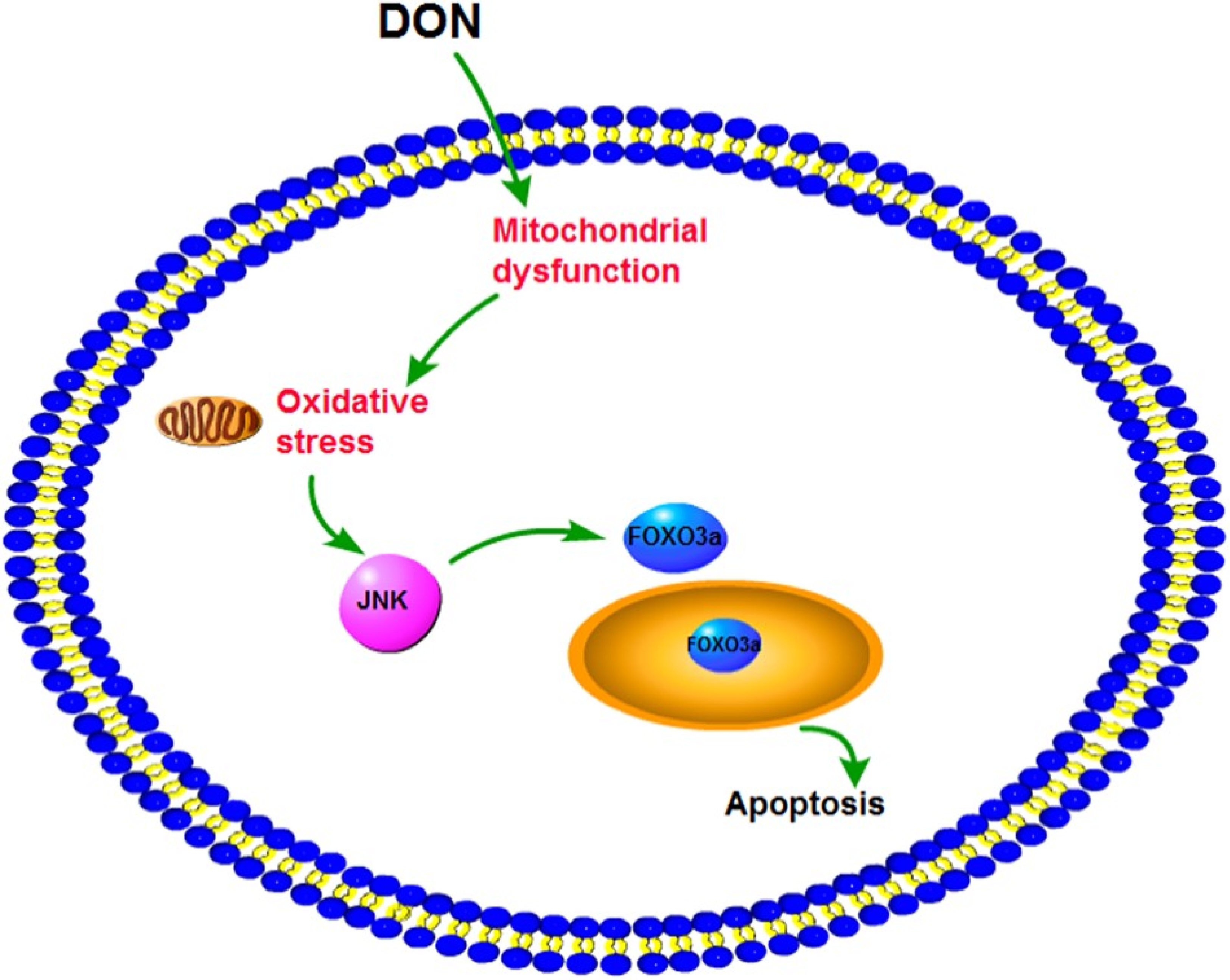 博士研究生杨云霞等基于DON毒素的致呕特性,选择胃肠系统中的人源性细胞GES-1与DON毒素暴露互作。研究结果表明,DON暴露可诱导GES-1细胞发生氧化应激,线粒体功能失调,激活ROS-JNK-FOXO3a信号通路;活化的FOXO3a发挥转录调节作用,影响细胞的抗氧化、周期阻滞及凋亡。还通过模式生物线虫对FOXO3a(同系物DAF16)进行了体内生物学功能验证。