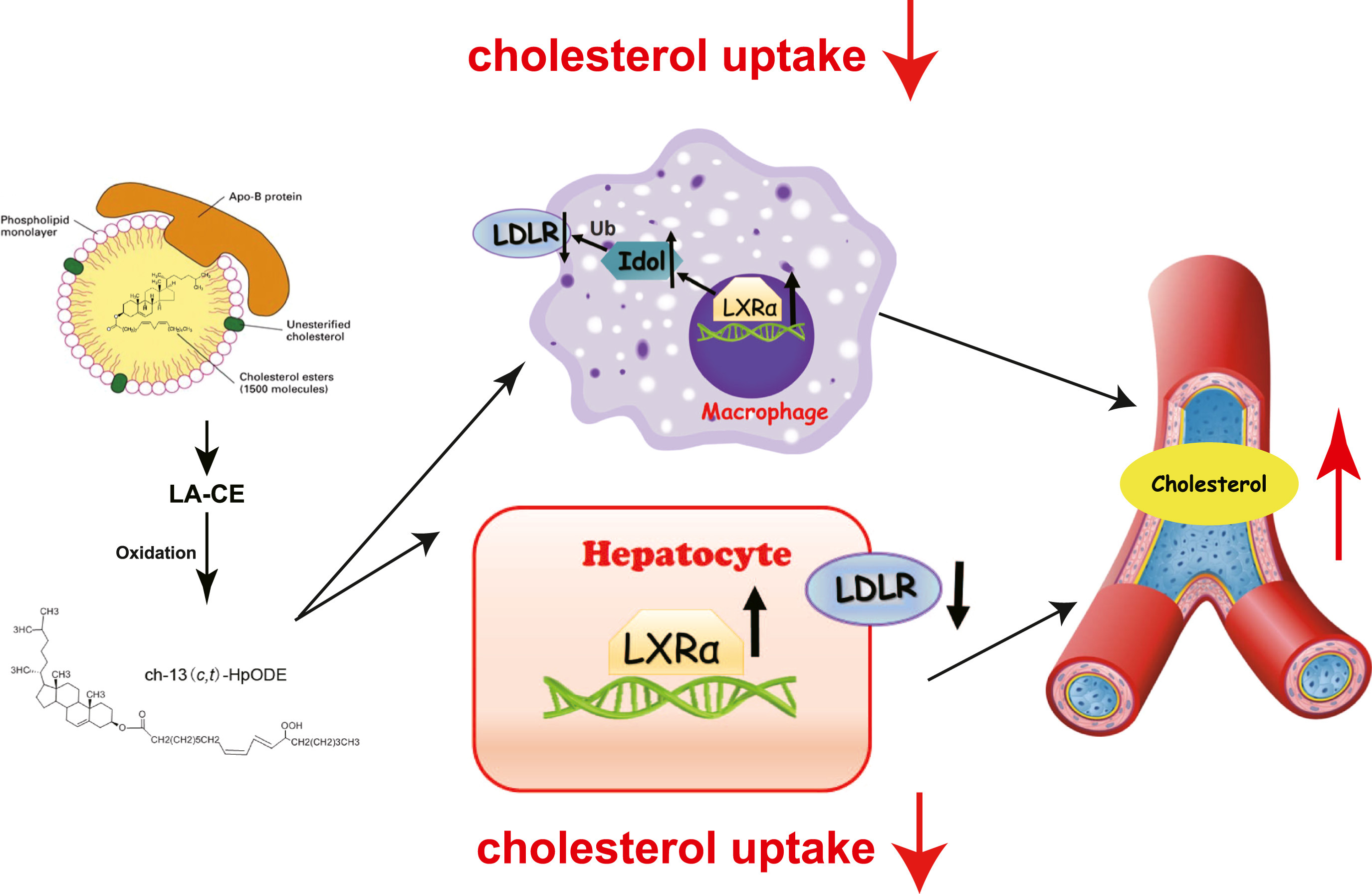 博士研究生郭姝媛等在尹慧勇研究员的指导下,利用靶标脂质组学技术分析正常对照(Healthycontrols,Con),冠心病组(Coronary heart disease,?CHD),心脑血管合并组(CHD+Cerebrovascular disease, CHD+CBD)及心梗组(Myocardial infraction, MI)的血浆样本。结果表明,疾病不同阶段具有明显不同的氧化胆固醇酯水平,并且在MI组明显上升。随后化学合成并纯化了一种主要的内源性oxCE,用于研究该类内源性代谢物对胆固醇代谢的作用。体内实验结果表明,ch-13(c,t)-HpODE可以减少肝脏和腹腔巨噬细胞的胆固醇含量,并增加血浆胆固醇的水平。通过体外实验发现,ch-13(c,t)-HpODE可以通过激活LXRα-IDOL-LDLR通路,抑制巨噬细胞的胆固醇摄入;同时,ch-13(c,t)-HpODE所引起的肝细胞胆固醇摄入的减少同样依赖于LDLR和LXRα。