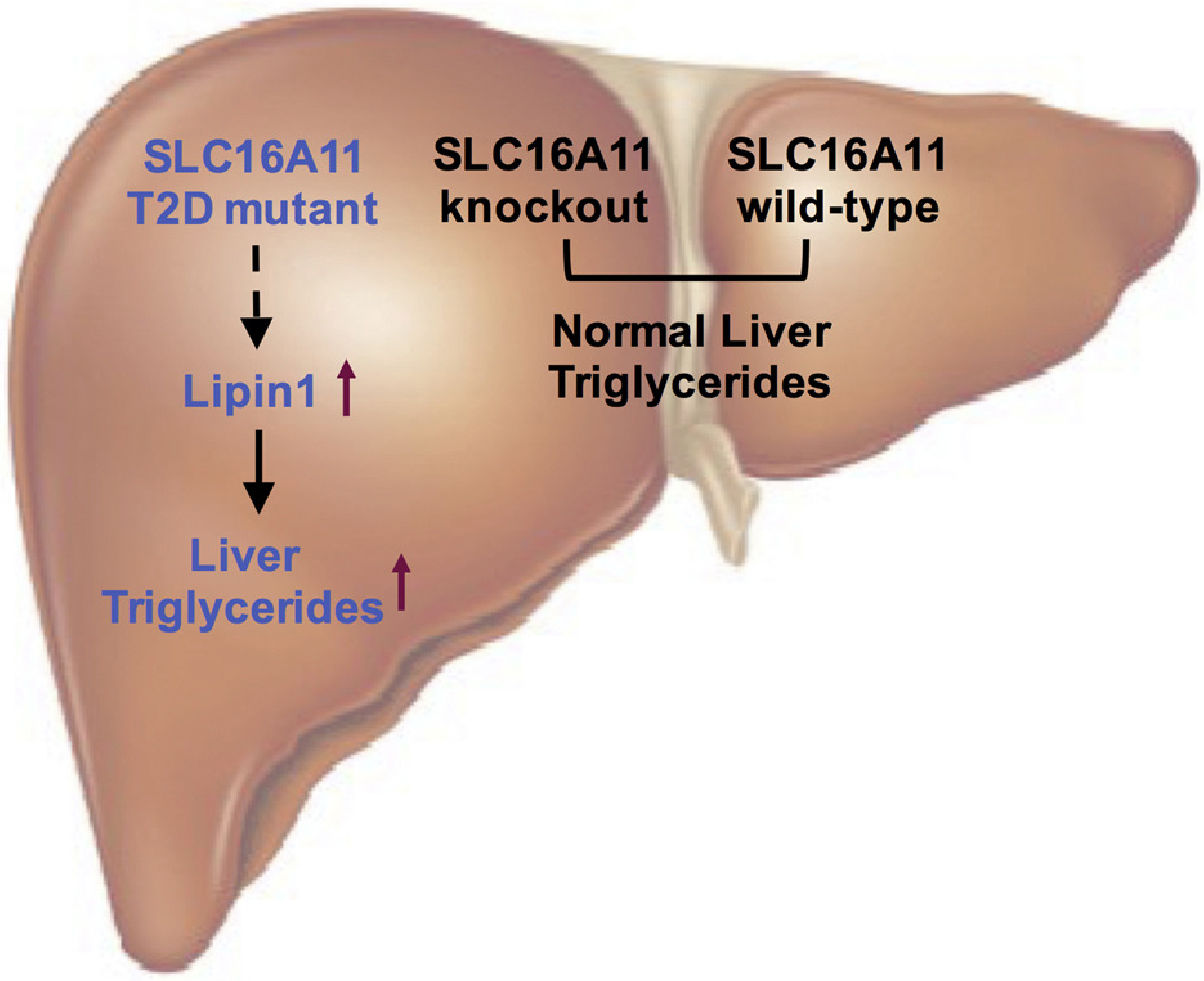 2017年,来自麻省理工和Broad研究所的Eric Lander研究组针对这个基因组区域2型糖尿病易感突变的功能进行了深入研究(Rusu V, et al. Cell 2017)。他们的研究发现部分SLC16A11定位于细胞质膜,运输底物为丙酮酸。而人群中发现的SLC16A11编码区突变导致SLC16A11功能缺失,无法正常定位质膜,影响丙酮酸运输,继而导致肝脏脂滴积累增加,促使2型糖尿病的发生;研究同时提出通过提高SLC16A11表达水平或活性来治疗2型糖尿病的潜在策略。但这项研究主要基于体外细胞过表达体系得到结论,缺乏体内生理状态下的直接证据。