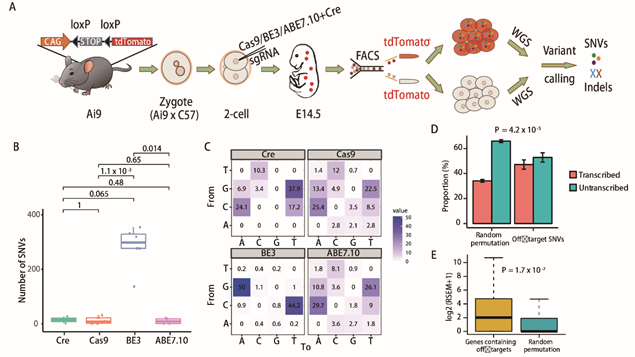 (A)实验流程?(B)脱靶位点数目比较。Cre-, Cas9-, BE3- and ABE7.10组分别有14+/-12 (SEM, n=2),?12+/-4 (SEM, n=11),?283+/-32 (SEM, n=6)和10 +/- 5 (SEM, n = 4)个SNVs?(C)突变类型的分布比较。每个格子中的数字表示该种突变类型占全部突变的比例 (D)脱靶SNVs富集在基因组中的转录区域?(E)Genes包含脱靶位点的基因在细胞胚胎中有更高的表达量。