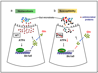 2019年3月19日,国际学术期刊Gastroenterology在线发表了中国科学院上海营养与健康研究所郭非凡研究组和同济大学附属第十人民医院刘占举教授研究组的最新合作研究成果“ATF4 Deficiency Promotes Intestinal Inflammation in Mice by Reducing Uptake of Glutamine and Expression of Antimicrobial Peptides”。该研究发现激活转录因子4(activating transcription factor 4, ATF4)通过结合启动子上氨基酸应答元件(AARE)直接转录激活谷氨酰胺(Gln)转运体基因SLC1A5表达,进而调控肠道上皮细胞中Gln水平,从而维持潘氏细胞分泌抗微生物肽的功能,揭示了氨基酸感应蛋白ATF4在维持肠道潘氏细胞分泌和调控肠道炎症的新功能。