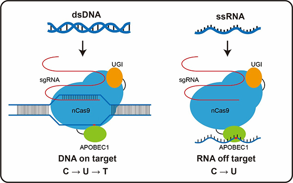 图注.单碱基编辑器BE3中的脱氨酶除了诱导DNA的胞嘧啶脱氨基转变成T,还能在RNA上造成大范围的脱靶。