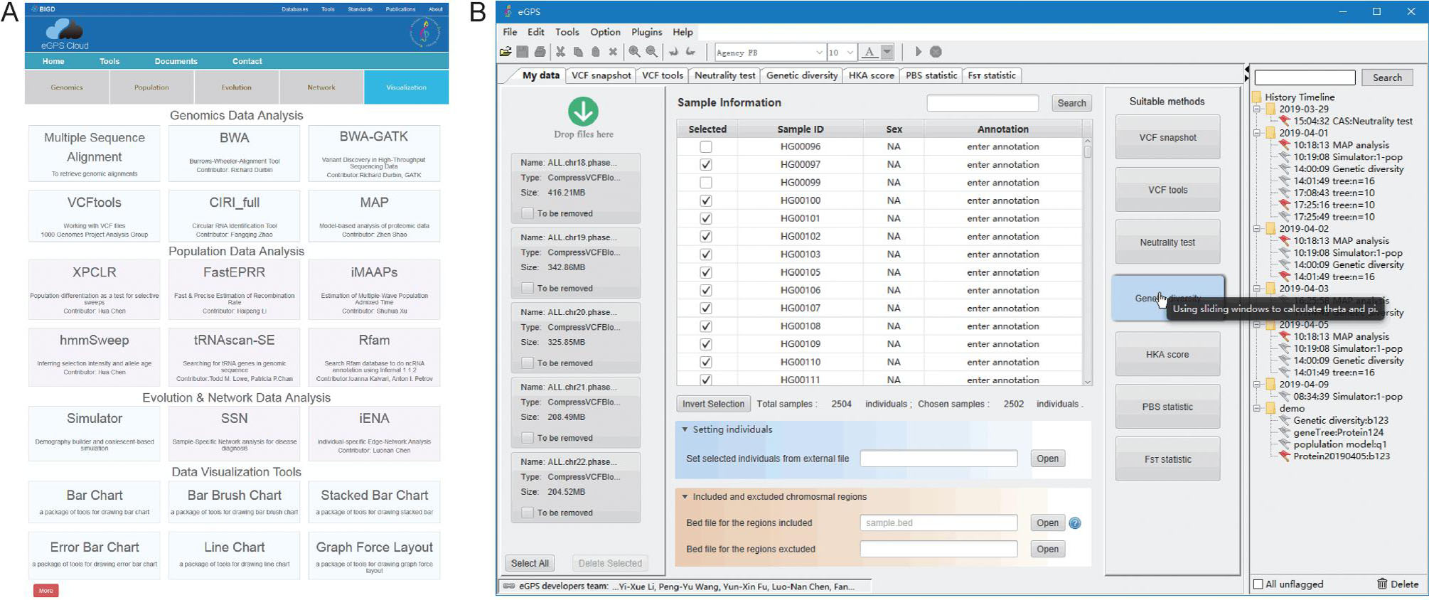 图A、eGPS Cloud网页界面,共包括15个软件以及20个可视化工具。