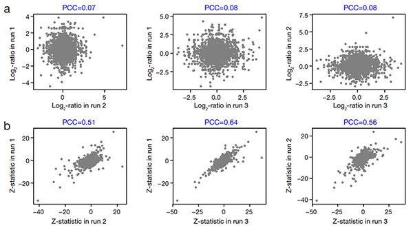 同位素标记定量蛋白质组数据长期存在比率压缩的难题。研究人员使用MAP模型分别比较分析了三个批次产生的小鼠胚胎干细胞分化前后蛋白质组数据,发现蛋白质iTRAQ信号log2比率在不同批次间关联很低(图二a),可能是因为技术误差对其贡献所服从的正态分布N(0, σ2)在批次间各不相同。根据MAP模型,研究人员提出使用每个批次的全局误差函数对其中每个蛋白质iTRAQ信号的log2比率进行重标度(rescaling),使得在不同批次中技术误差对其贡献均服从标准正态分布N(0, 1),从而发展了一个新的Z统计量。比较不同批次蛋白质Z统计量之间的关联,可以发现它具有明显更好的可重复性(图二b)。