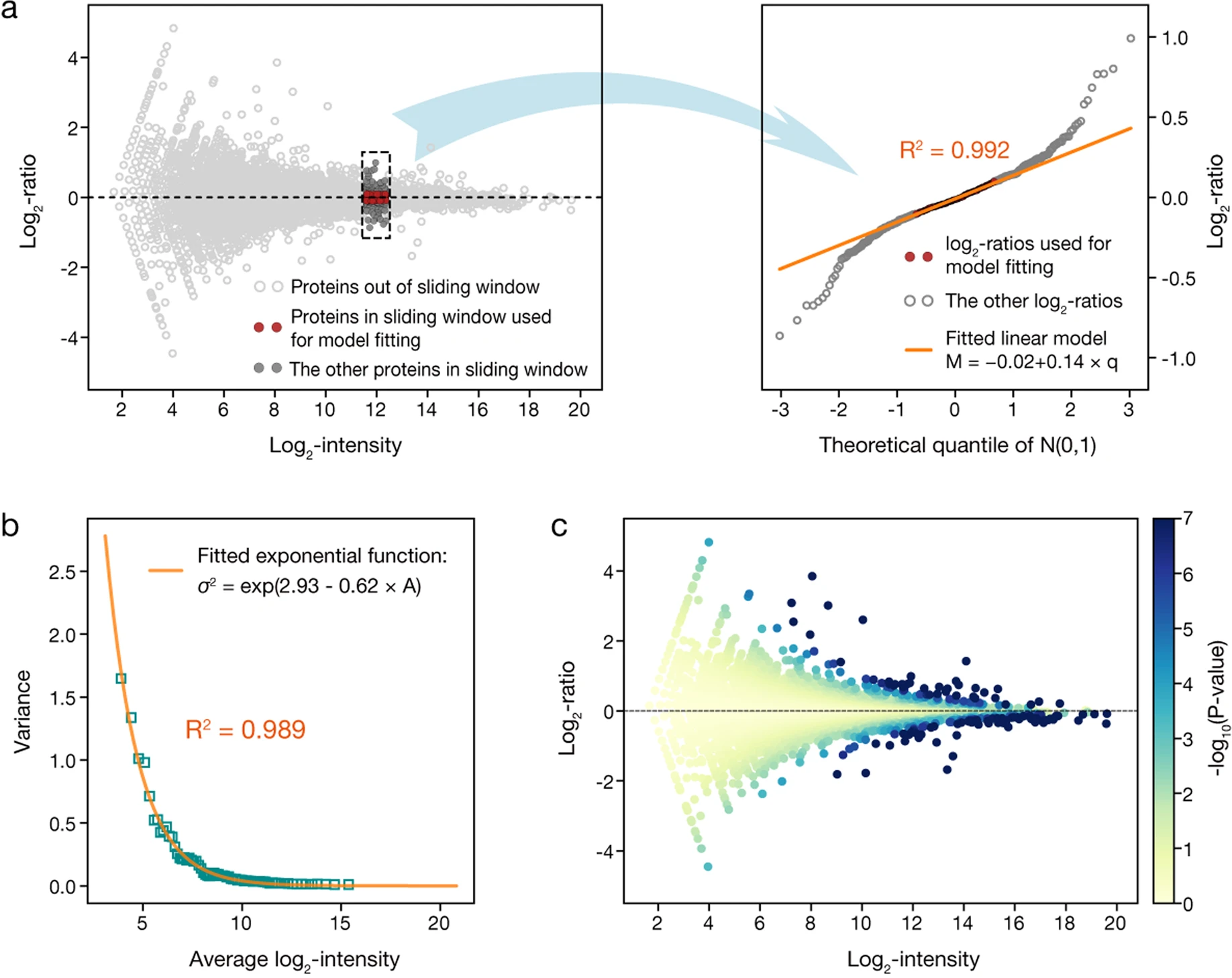 (a)局域线性拟合;(b)全局指数拟合构建技术误差模型;(c)计算每个蛋白质信号差异的显著性P值。
