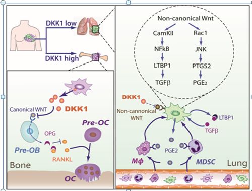 博士研究生壮雪倩在胡国宏研究员的指导下,发现肿瘤分泌的WNT信号抑制蛋白DKK1调控了癌细胞转移时对靶器官的选择性。DKK1高分泌的肿瘤倾向转移到骨,而低分泌的肿瘤倾向转移到肺。他们通过与山东大学团队合作发现乳腺癌病人血清中DKK1蛋白水平可预测乳腺癌骨转移和肺转移的风险。进一步的功能研究表明,DKK1在肺和骨转移微环境中通过靶向不同细胞的不同信号通路从而发挥相反的转移调控作用。在肺中DKK1抑制非经典WNT通路,减少巨噬细胞和中性粒细胞的招募并同时抑制癌细胞分泌生长因子TGFβ的水平,从而抑制肺转移。而在骨中DKK1通过抑制成骨细胞的经典WNT信号,从而促进骨转移形成。对肿瘤施用经典WNT信号通路抑制剂后,肺转移并未显著下降而骨转移情况恶化。相反的,联合使用JNK和TGFβR抑制剂能够同时抑制肺转移和骨转移。