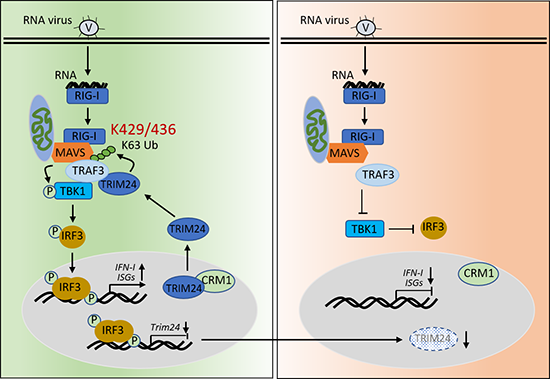 泛素化修饰是一种常见的翻译后修饰类型,并且已有多篇文章报道泛素化修饰在抗病毒免疫中的重要作用。该研究首先通过高通量转录组测序(RNA-seq)找到了49个在被VSV病毒感染后表达出现显著差异的泛素化调控基因,随后通过siRNAs干扰这些基因的表达研究这些泛素化调控基因是否在抗病毒感染中发挥重要的作用。进一步研究筛选到了一种TRIM家族蛋白的E3泛素连接酶TRIM24能够显著提高Ⅰ型干扰素的表达,并且能够降低感染病毒的细胞内的病毒滴度。体内实验也证明TRIM24具有很强的抗病毒功能。接下来的研究发现,VSV病毒感染之后,TRIM24可以在CRM1蛋白的介导下从细胞核转移到胞浆中,并且最终在线粒体上面聚集。随后TRIM24与TRAF3分子发生共定位,介导TRAF3蛋白K429/K436位点的K63连接的泛素化修饰,促进TRAF3分子与MAVS以及TBK1的结合,进而促进IRF3的激活,增强了Ⅰ型干扰素的表达。随后研究人员继续探究TRIM24受RNA病毒感染调控的机制,发现病毒引起活化的IRF3入核之后,可以直接结合在TRIM24基因的启动子区域,引起TRIM24基因的转录抑制,最终导致TRIM24蛋白的表达降低,使病毒感染后期的Ⅰ型干扰素的表达下调,避免机体长期的免疫过度活化。该研究首次表明TRIM24在抗病毒免疫中具有重要的作用,因此靶向TRIM24分子可以作为抗病毒免疫干预的潜在分子靶标。