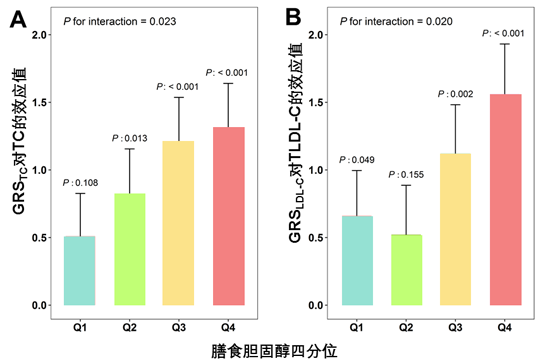 A. 随着膳食胆固醇的升高,GRSTC对血液TC升高的作用增强;B. 随着膳食胆固醇的升高,GRSLDL-C对血液LDL-C升高的作用增强。