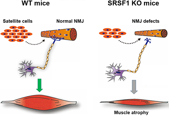 图:SRSF1敲除导致骨骼肌卫星细胞增殖缺陷,NMJ紊乱和骨骼肌萎缩