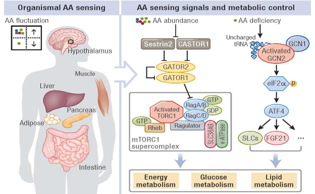 机体能量和糖脂代谢稳态失衡是诱发代谢性疾病的主要驱动因素。众所周知,遗传和营养是导致代谢失衡的主要因素,其中营养可通过调控代谢器官或组织细胞信号网络来影响代谢性疾病的发生发展?;灏蠛炅坑兀禾恰⒅嗪桶被?。传统观点认为氨基酸只是作为机体合成蛋白质和肽类的主要原料,但近年来其作为信号分子参与代谢稳态的维持和调控受到广泛关注。研究报道,支链氨基酸(包括亮氨酸、异亮氨酸和缬氨酸)与人群肥胖及2型糖尿病的发生密切相关,揭示了氨基酸营养失衡可能是代谢性疾病发生的重要因素。这其中的调控机制也陆续被报道,即氨基酸作为信号分子,其水平的升高或降低会激活或抑制相应代谢器官或组织中细胞的营养感应信号通路,并进一步调控糖脂等代谢的平衡。那么,机体主要代谢器官,包括中枢下丘脑、肝脏、胰腺和脂肪组织等对氨基酸水平的改变是如何感应的?以及这些代谢器官感应氨基酸改变之后如何调控机体能量和糖脂代谢的?阐述这些问题对于解析人类代谢性疾病的发病机理及相关药物研发具有重大意义。在该综述论文中,对氨基酸的感受器及其信号转导通路,特别是mTORC1和GCN2信号通路进行了详尽的梳理;全面总结了氨基酸感应信号调控机体能量和糖脂代谢的最新研究进展;结合氨基酸代谢特征与人群代谢性疾病发病的相关性,讨论了两者之间的因果关联,并对氨基酸感应信号作为开发治疗人类代谢性疾病和癌症的潜在药物靶标进行了探讨;针对氨基酸感应机制未来研究方向及其靶向药物研发存在的局限性和问题进行了总结、探讨和展望。