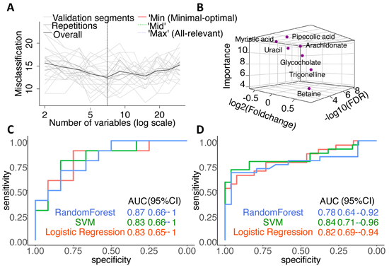 除了系统地分析高尿酸血症和痛风的代谢轮廓变化外,研究人员还利用三种机器学习算法成功筛选到了13种潜在的代谢物,以区分高尿酸血症和痛风。其中,7种代谢物用于区分高尿酸血症和正常尿酸对照,在训练集和验证集中的最大AUC为0.94和0.82;4种代谢物将正常尿酸和痛风分类的最大AUC接近于1;更重要的是,研究确定了7种代谢物作为区分痛风和无症状高尿酸血症的潜在代谢物,其训练集和验证集中的最大AUC为0.87和0.84(图示)。如上所述,区分痛风和高尿酸血症的预测模型具有重要的临床意义。