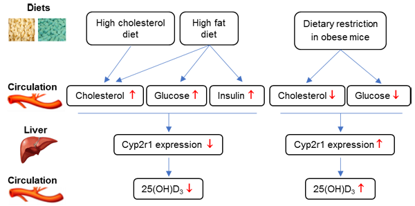 研究者进一步利用高脂饮食诱导的肥胖及代谢紊乱模型小鼠,观察通过限制饮食降低体重、改善糖脂代谢紊乱是否能改善维生素D代谢。发现将小鼠的摄食量降至对照小鼠的2/3后10周,小鼠的体重显著降低,高胆固醇血症、高血糖显著减轻,肝脏Cyp2r1表达及血液25(OH)D水平显著升高。