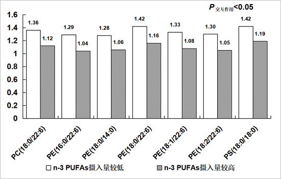 图5. 根据红细胞膜n-3 多不饱和脂肪酸(PUFAs)水平对血浆甘油磷脂与新发代谢综合征间关联关系进行分层分析