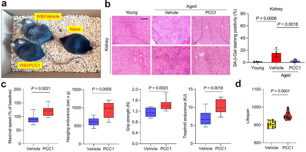 研究人员随后在多种小鼠模型中论证PCC1清除体内衰老细胞的有效性和安全性,结果证明在自然衰老的老年小鼠模型中,PCC1能清除老年小鼠多种组织器官类型中的衰老细胞,增强小鼠生理机能并延长老年小鼠寿命。