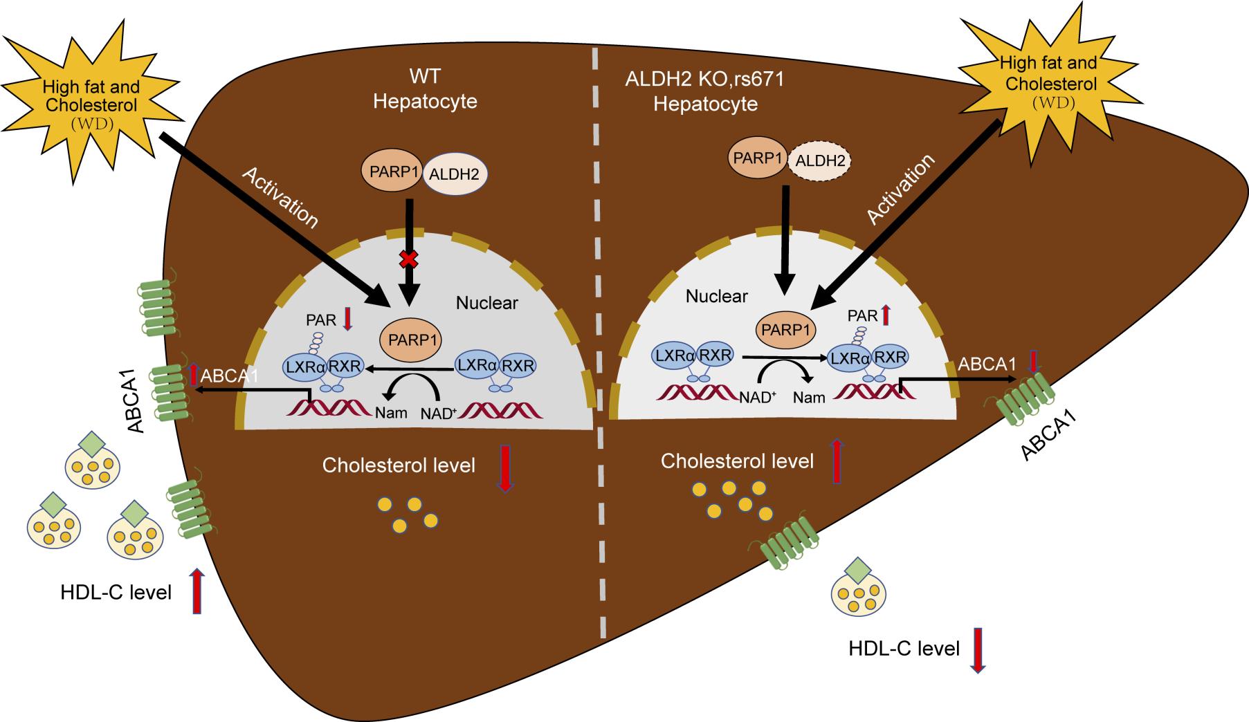 在本项目中,研究人员发现给予西方饮食的ALDH2敲除,ALDH2/LDLR双敲,和ALDH2 rs671敲入的小鼠血浆HDL-C显著下降,但肝脏胆固醇水平与脂质堆积增加,肝脏胆固醇外排生成HDL-C的重要蛋白ABCA1下调表达,提示肝脏ALDH2在调控HDL代谢中发挥重要作用。接着,利用非靶向高分辨质谱代谢组学发现ALDH2/LDLR双敲小鼠与LDLR敲除小鼠相比,在给予西方饮食时血清中腺苷二磷酸核糖(ADP-Ribose)水平显著升高,提示PARP1通路可能参与其中。进一步的机制研究发现:ALDH2与PARP1的入核序列结合抑制PARP1的入核,使其对LXRα的聚(ADP-核糖基)化下降,从而促进ABCA1的表达,最终增加肝脏胆固醇的外排与生成HDL。相反,ALDH2的敲除或者突变解除降低了其对PARP1入核的抑制,使LXRα的聚(ADP-核糖基)化增加,抑制ABCA1的表达,减少肝脏胆固醇的外排,从而造成血液HDL-C水平下降。PARP1的抑制剂PJ34在ALDH2敲除小鼠中可以逆转由于西方饮食引起的肝脏脂质堆积,增加ABCA1表达,升高血液HDL-C水平。结合前期的研究,在人肝脏组织中由于ALDH2 rs671突变促进其降解,造成蛋白水平降低,同样减少ALDH2对PARP1入核的抑制,增加LXRα的聚(ADP-核糖基)化,从而降低ABCA1的表达和肝脏胆固醇向血浆中的外排与HDL的生成。
