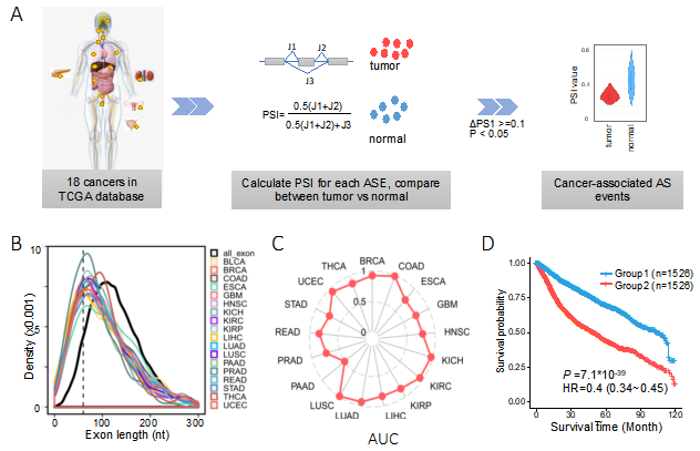 图注:A.基于TCGA数据库中18种癌症鉴定癌症相关的剪接事件流程。B.所有人类外显子和每种癌症类型中异常剪接外显子的长度分布图。C.利用剪接建立随机森林模型在每种癌症类型中的AUC值。D.基于CASE评估的风险因子进行分组的癌症患者的Kaplan-Meier曲线。