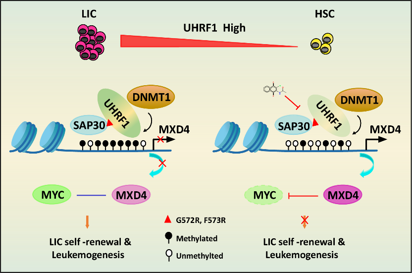 2022年10月27日,国际学术期刊Cell Research在线发表了中国科学院上海营养与健康研究所王兰研究组合作发表的题为“Targeting UHRF1-SAP30-MXD4 axis for leukemia initiating cell eradication in myeloid leukemia”的最新研究成果。该研究阐明了UHRF1在急性髓系白血病(Acute myeloid leukemia, AML)发展和维持过程中的作用机制并筛选得到针对UHRF1的特异小分子抑制剂,为AML临床治疗提供了理论基础和潜在的诊疗策略。