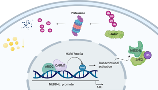 该研究发现,Arid2肝脏特异性敲除的小鼠在正常饮食下7个月时会自发产生肝脏脂肪变性,高脂饮食则会加剧这一进程。研究人员进一步探索了其中的机理并揭示ARID2通过负调控JAK2-STAT5-PPARγ影响了肝脏脂质代谢?;蒲芯糠⑾郑珹RID2通过上调E3连接酶NEDD4L的转录从而促进JAK2的泛素化。ARID2招募CARM1到NEDD4L的启动子区域,增加该区域组蛋白H3第17位精氨酸的不对称双甲基化(H3R17me2a)从而促进其转录。此外,在Arid2肝脏特异性敲除的小鼠中,JAK2的抑制剂Fedratinib能够有效的缓解高脂饮食诱导的肝脏脂肪变性。在商业购得的NAFLD病人的肝脏样本中,研究人员检测到了较低的ARID2蛋白水平并且验证了ARID2与JAK2的负相关性。综上所述,该研究揭示了ARID2在维护肝脏脂质稳态中的重要作用,并为ARID2缺失的NAFLD患者提供了有效的治疗策略参考。