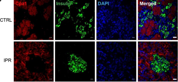图:两组大鼠的胰岛免疫荧光染色,间歇性蛋白限制有助于增加胰岛形态完整性