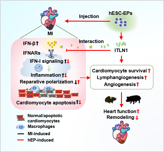研究人员利用小鼠和猪心梗模型,结合多种研究方法发现心梗急性期移植hEPs促进小鼠心功能恢复、抑制疤痕形成,并伴随着单核/巨噬细胞浸润减少、修复型巨噬细胞增多、促进心肌细胞存活和血管、淋巴管新生?;品治龇⑾謍EPs移植显著抑制梗死心肌炎症反应,尤其是下调I型干扰素(IFN-I)信号;IFN-I受体激动剂RO8191削弱hEPs介导的抑制炎症反应、促进修复型巨噬细胞极化和心肌修复的作用;质谱筛选和多方验证发现hEPs分泌内凝集蛋白(ITLN1),其可与IFN-β结合,模拟hEPs抑制IFN-I介导的炎症反应和促进修复型巨噬细胞极化的作用;移植ITLN1敲低的hEPs则取消hEPs在梗死心脏抑制IFN-I信号、炎症调控和心肌修复作用。进一步,在更接近临床的猪心梗模型证明移植hEPs抑制炎症反应、促进猪梗死心肌修复,且未观察到器官毒性。综上,hEPs移植促进小鼠和猪梗死心肌修复,其主要机制之一是hEPs分泌的ITLN1与IFN-β相互作用,进而抑制IFN-I途径介导的巨噬细胞炎症反应、促进修复型巨噬细胞极化。该研究揭示了hEPs及分泌的蛋白因子通过抑制IFN-I途径调控炎症反应,进而促进心肌修复的重要作用,并发现了调控IFN-β的新模式和调控炎症反应的新机制,证明精确调控急性心梗后炎症反应对心肌修复至关重要、提示hEPs有可能成为心梗后心肌修复的新型细胞来源。