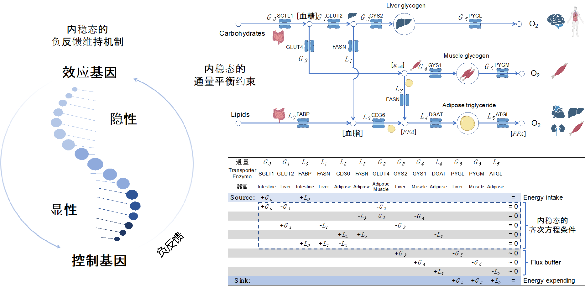 通过这一新构造的覆盖人体49个组织16,448个常染色体基因的剂量敏感性图谱,研究团队发现基因的剂量约束来源于维持机体内稳态的负反馈机制。生物控制系统和所有控制系统的原理一致,效应器(酶/转运体/细胞因子/受体)是剂量耐受的(对应基因突变是隐性遗传),而控制器(转录因子/激酶/离子通道/转录翻译机器)是剂量敏感的(对应基因突变是显性遗传)?;谏瓒ǖ悖╯et-point)的负反馈机制(即控制器根据系统离设定点的差来决定效应器的调节方向),是通量平衡方程(物质守恒和能量守恒)的通用解法,也是生命体控制系统稳态维持的普遍机制。其中,通量的大小(物质流、能量流)是由效应基因直接调节的,而负反馈的设定点(如血糖、体温、血压等)是由控制基因所决定的。