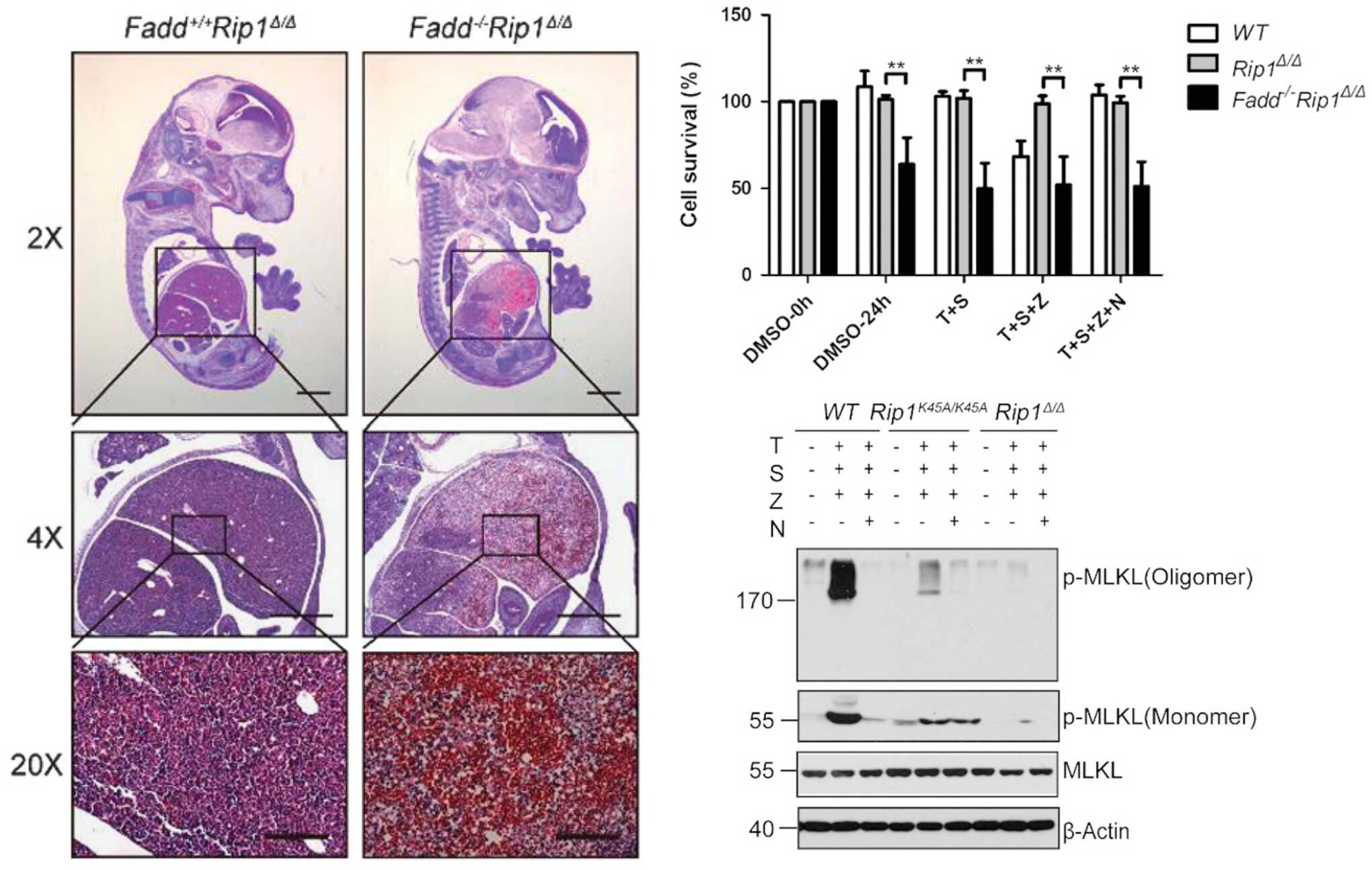 在章海兵研究员的指导下,博士研究生刘永波、范存先等通过构建RIP1激酶结构域不同关键位点突变的小鼠,发现激酶活性的缺失不影响成体小鼠的正常生存,但体内体外实验均证实RIP1激酶活性的降低会特异性的阻断细胞程序性坏死的发生。之前研究发现细胞凋亡基因FADD的缺失导致的胚胎致死是细胞程序性坏死依赖的,即RIP1、 RIP3或MLKL的敲除能够挽救FADD敲除小鼠的胚胎发育致死。因此我们利用RIP1激酶结构域不同位点突变小鼠与FADD敲除小鼠交配,意外发现RIP1激酶结构域中不同关键位点的突变在抑制FADD敲除小鼠的胚胎致死及介导炎症中的作用不同。进一步对其机制探究,发现RIP1激酶结构域中不同关键位点突变导致其激酶活性缺失程度不一致,从而导致了RIP3、MLKL的磷酸化及多聚化减弱而阻断细胞程序性坏死的程度不同。此外,本研究还发现在FADD缺失条件下,RIP1激酶活性的降低还能诱导胚胎发育过程中过度炎症的产生。RIP1的激酶活性小分子抑制剂Nec-1已经在包括神经退行性疾病等多种疾病的临床研究阶段,这一研究为进一步开发针对RIP1不同激酶活性位点的药物提供理论依据及动物模型。