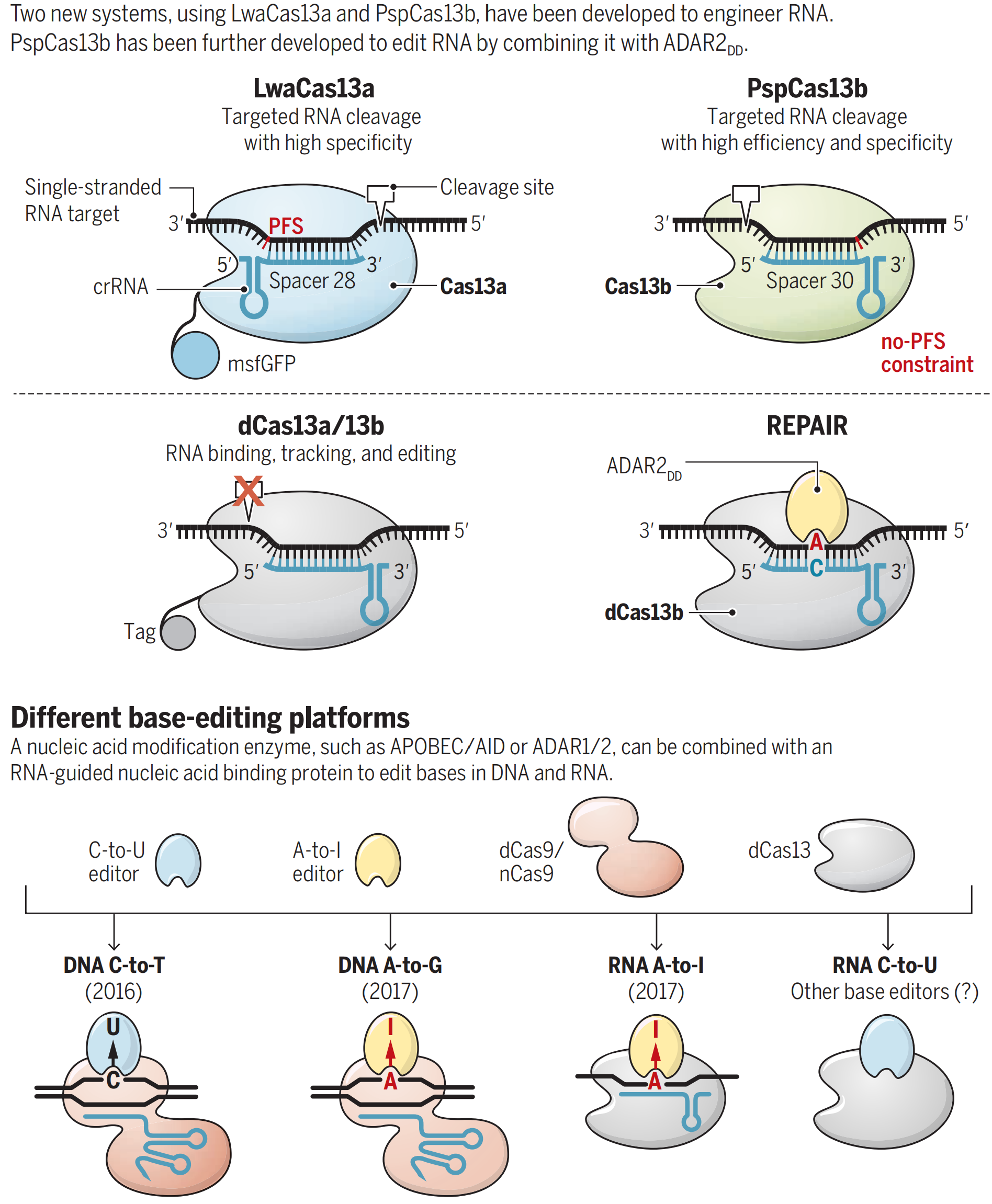 RNA水平的基因表达调控与生物体正常生理功能息息相关,其异常变化则导致多种重要人类疾病的发生, 但是对RNA的改造操作手段则比较匮乏。来自Broad研究所的Feng Zhang教授研究组首先在Nature上报道了class 2 type VI CRISPR-Cas-Cas13a可对RNA分子进行靶向切割,进而实现 RNA水平抑制基因表达的功能;而RNase失活改造的dCas13a则可以用于追踪内源RNA分子的细胞定位研究等。在当期Science,Feng Zhang教授研究组进一步筛选了多种class 2 type VI CRISPR-Cas系统(包括Cas13a、Cas13b和Cas13c),展示了来自Prevotella sp.的Cas13b(PspCas13b)具有最优的RNA靶向切割效应,其比RNAi系统具有更好的专一性和更低的脱靶效应;研究人员进一步将RNase失活改造的dCas13b与A-to-I RNA编辑酶ADAR偶联(REPAIR系统),实现了在RNA水平上的A-to-I/G单碱基编辑(base editing)。来自Harvard大学的David Liu教授研究组在2016和2017年分别报道了DNA水平的C-to-T 和A-to-G单碱基编辑。相对于DNA水平的单碱基编辑,RNA水平的单碱基编辑避免了任何由于对遗传基因组DNA操作所引发的脱靶效应的担忧。由于RNA在细胞内的丰度和结构都千差万别,REPAIR系统介导的RNA单碱基编辑会因RNA不同而异。当然,DNA和RNA水平的单碱基编辑为基因编辑改造以治疗疾病又提供了多种可供选择的高效手段。