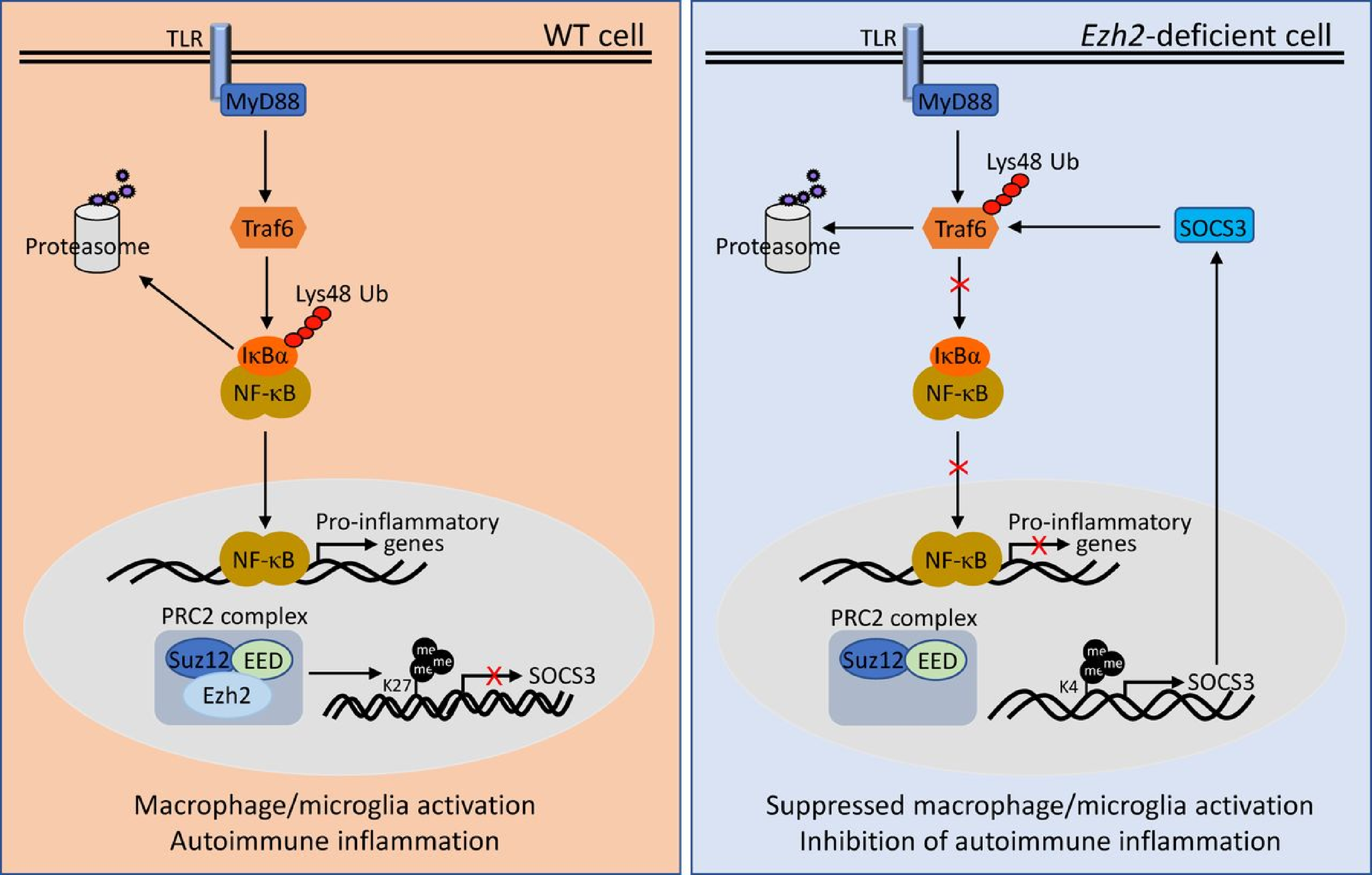 在本研究中,博士研究生张兴利等在肖意传和秦骏研究员的共同指导下,利用遗传小鼠模型揭示了Ezh2在巨噬细胞与小胶质细胞中通过靶向抑制抗炎症性基因Socs3的表达,进而介导了巨噬细胞与小胶质细胞在炎症部位的活化,由此促进了炎症性肠炎与实验性自身免疫性脑脊髓炎的发病。当利用Ezh2选择性抑制剂GSK126抑制H3K27me3,或当Ezh2在髓系来源的细胞中特异性敲除后,骨髓来源的巨噬细胞与小胶质细胞的炎症性活化受到了显著抑制,相应自身免疫性疾病的发病也得到了缓解。进一步分子机制研究发现,Ezh2特异性的靶向Socs3基因的启动子区域,促进了相关区域H3K27me3的表达,由此抑制了抗炎基因Socs3的表达。因此,?Ezh2缺失会显著促进Socs3基因的表达,大量产生的Socs3又介导了Traf6的泛素化降解作用,并进一步抑制了下游NF-κB信号通路的活化与促炎症基因的表达(下图)。有意思的是,多发性硬化病人脑部基因表达谱数据表明,EZH2在病人脑组织中的表达相较正常人脑组织的表达有明显升高的趋势,提示EZH2可能介导了多发性硬化病理过程中小胶质细胞的炎症性活化,并参与了疾病的发生发展,因此其可作为一个潜在的自身免疫性疾病的治疗靶标。