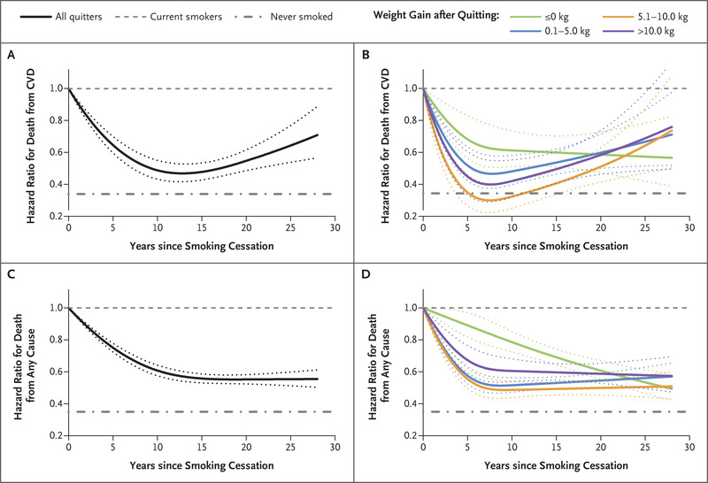 图二,戒烟后,总人群中的心血管疾病死亡率(A)和总死亡率(B)风险,不论体重增长如何均下降(C和D)。体重增长者(B中橙色、蓝色、紫色线)的心血管疾病死亡率在长期出现小幅度反弹。