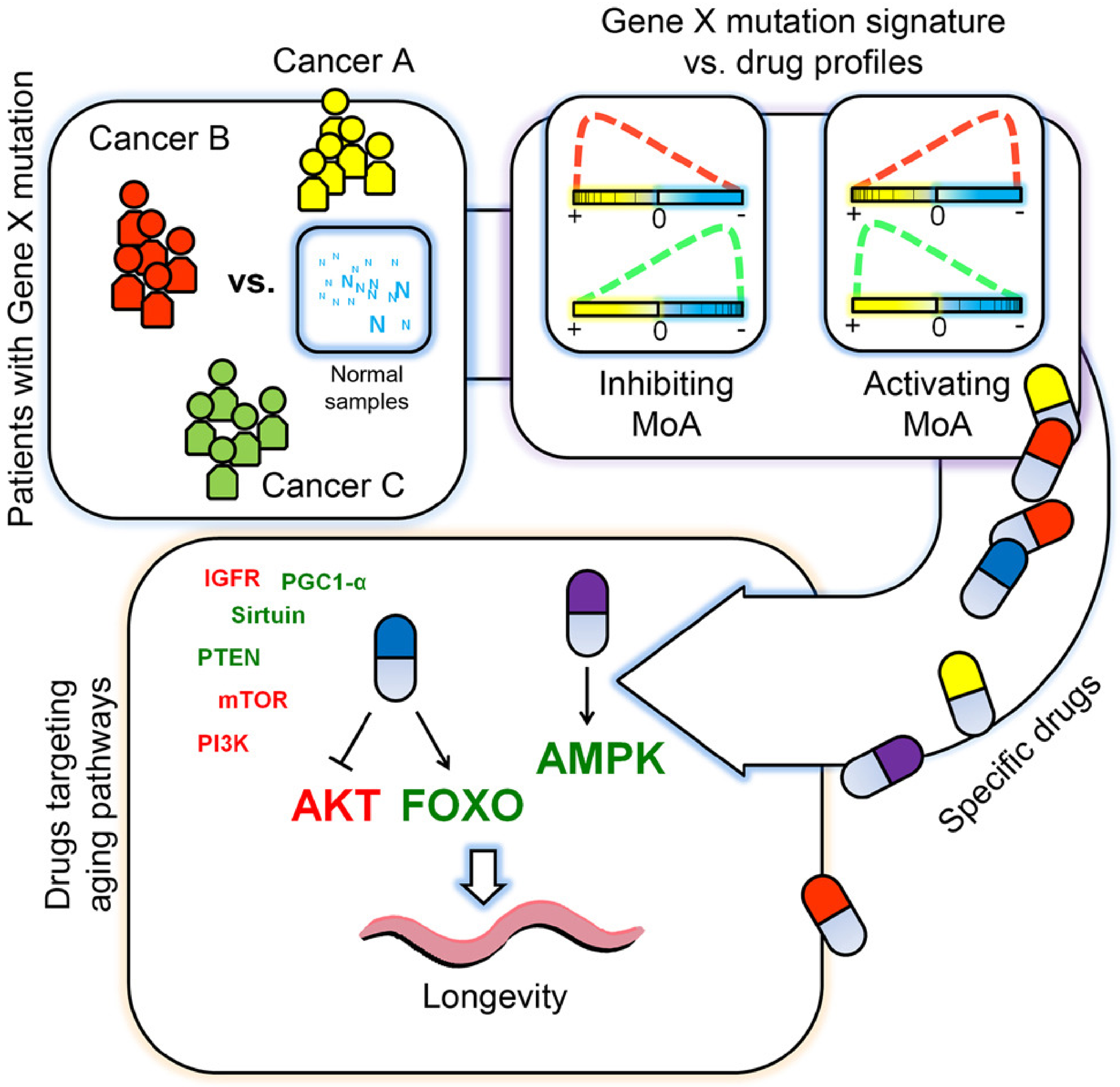 针对药物重定位的大规模实验筛选常常被局限在基于体外细胞或非人模式动物的环境下进行,缺少对真实人体情况的反映。基于细胞实验的筛选结果通常带有细胞系特异性,而且所能研究的靶点数目有限。在该研究中,研究人员构建了基于人体内环境的无细胞或组织特异性偏好的高通量药物靶基因的计算筛选方法,从TCGA癌症数据库中提取了8476个人类编码基因的单基因突变的、非组织特异性的“转录组核心标签”并将癌症背景予以去除,从而构建了全基因组水平的单基因靶点的筛选体系;并开发了“核心标签-药物-基因相互作用”(core-signature Drug-to-Gene,?csD2G)算法,用这8476个转录组核心标签分别扫描3546个药物处理转录组标签来预测药物重定位新靶点,并且构建药物-靶点特异性评估体系,为1938个药物和3758个基因筛选出179004个高特异性的药物-基因靶向关系。在靶点预测的覆盖率和特异性上,csD2G优于体外细胞实验基因干扰标签、L1000实验标签的药物-靶点预测、以及现存的药物重定位算法。研究人员随后将该方法扩展到三方面研究予以应用:1)重定位一类抗精神病药物(吩噻嗪)去抑制TGF-β信号通路;2)重定位一类降血压药(钙离子通道拮抗剂)去激活AMPK、抑制AKT信号通路,并用临床电子病历验证;3)重定位并功能验证7个药物去特异选择性地靶向AKT-FOXO及AMPK通路,并延长线虫寿命。