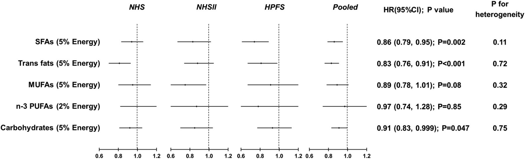 本研究纳入了三个大规模的前瞻性队列研究【The Nurses' Health Study(NHS),?NHSII,?Health Professionals Follow-Up Study(HPFS)】的214,028名调查对象。研究人员通过分析每2-4年更新一次的膳食频率问卷所获的随访数据,结合持续更新的食品成分数据库,评估调查对象n-6系列多不饱和脂肪酸摄入量。在随访期内,共发现18,442例2型糖尿病。多因素调整分析结果显示,亚油酸摄入与2型糖尿病风险呈负相关。当亚油酸等热量替换(按每日总能量摄入的5%计算)饱和脂肪时,2型糖尿病风险下降14%;替换碳水化合物时,风险下降9%;替换反式脂肪(按每日总能量摄入的2%计算)时,风险下降17%(图)。另外,花生四烯酸摄入与2型糖尿病风险呈正相关。