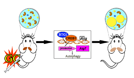 在本课题中,科研人员选择了糖皮质激素药物的代表药之一地塞米松进行研究。向小鼠注射地塞米松1周能够显著增加其全身脂肪和白色脂肪含量。科研人员发现地塞米松处理小鼠的棕色脂肪发生白色化:棕色脂肪组织中脂滴变大,脂质含量增加,UCP1表达下降,氧耗减少。进一步研究表明,地塞米松能够增加棕色脂肪细胞中自噬相关基因7(autophagy related 7,ATG7)的表达从而激活自噬作用。自噬是维持内环境稳态的重要方式。自噬过程中,受损的细胞器或细胞质成分被双层膜的自噬体包裹并运送至溶酶体中进行降解并重新利用。向小鼠体内注射氯喹或利用病毒降低棕色脂肪ATG7表达能够抑制自噬作用,阻止地塞米松诱导的棕色脂肪白色化以及全身脂肪含量的增加。进一步检测发现,地塞米松对于ATG7表达的调控依赖B cell translocation gene 1(BTG1)/ cAMP response element binding protein 1(CREB1)信号通路。脂肪组织特异性过表达BTG1小鼠棕色脂肪发生白色化,全身脂肪含量增加。利用病毒降低棕色脂肪BTG1表达能够阻止地塞米松诱导的棕色脂肪白色化以及全身脂肪含量的增加。以上工作证明了抑制自噬作用可有效缓解糖皮质激素诱导的肥胖,加深了人们对于糖皮质激素作用机制以及棕色脂肪白色化过程的理解和认识。