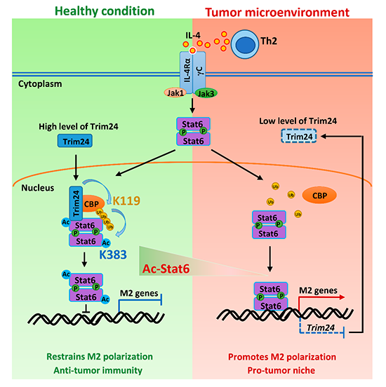 进一步的体内研究表明,Trim24基因在巨噬细胞中缺失后抑制了肿瘤微环境TAMs中Stat6蛋白K383位点的乙?;奘?,进而促进了TAMs向M2方向的极化,由此促进了肿瘤的生长。研究人员还发现,乳腺癌病人肿瘤组织中TAMs相较癌旁正常组织中巨噬细胞表达更低水平TRIM24与更高水平的M2基因,且肿瘤细胞条件性培养基能明显抑制人单核或巨噬细胞中TRIM24表达。这些结果提示肿瘤微环境可能通过抑制TAMs中Trim24的表达进而抑制Stat6的乙?;?,从而进一步促进了TAMs向M2方向极化,并维持了肿瘤中免疫抑制性的微环境状态。因此,靶向Stat6乙?;奘位蛘逿rim24活性可以作为肿瘤免疫干预的潜在分子靶标。