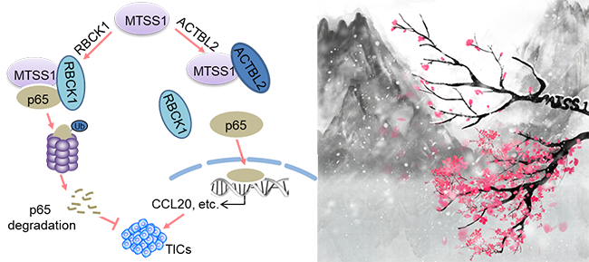 此项研究发现,在管腔型和基底型乳腺癌小鼠肿瘤模型中,敲除Mtss1增强了正常乳腺上皮细胞向肿瘤起始细胞的转化,并提高其致瘤性和转移性。在乳腺癌病人来源的异体移植物和类器官中同样证实了MTSS1抑制肿瘤起始的功能以及乳腺癌细胞的迁移与侵袭,表明MTSS1是乳腺癌发生发展的负调控因子?;蒲芯勘砻鳎?MTSS1与E3泛素连接酶RBCK1相互作用,促进RBCK1介导的p65蛋白的泛素化及降解,从而抑制NF-κB信号通路和肿瘤形成。同时,在癌细胞内存在另一蛋白ACTBL2,能通过与RBCK1竞争性地结合MTSS1,进而稳定p65,激活NF-κB下游靶基因的转录,促进肿瘤发生。