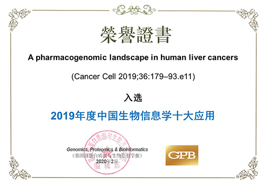 2020年2月,肝癌药物基因组学“蓝图”,通过《基因组蛋白质组与生物信息学报》(Genomics, Proteomics & Bioinformatics, 简称GPB)组织的领域同行专家评审,成功入选2019年度“中国生物信息学十大应用”。该工作是由中国科学院生物化学与细胞生物学研究所惠利健团队、中国科学院上海营养与健康研究所李亦学团队、中国人民解放军海军军医大学张海斌团队和南京大学附属鼓楼医院施晓雷合作完成,于2019年8月在国际顶级学术期刊Cell旗下子刊Cancer Cell上发表的研究成果。该成果构建了目前最大的肝癌细胞模型平台,包括50株新建立的中国病人来源的肝癌细胞系和31株发表的肝癌细胞系,重现了肝癌患者的基因组和转录组异质性。通过整合大规模测序和高通量药物筛选数据,研究人员建立了肝癌中基因组变异与药物响应的相关性,发现了新的治疗靶点和分子标志物,为索拉菲尼的个体化治疗提供了循证医学证据。