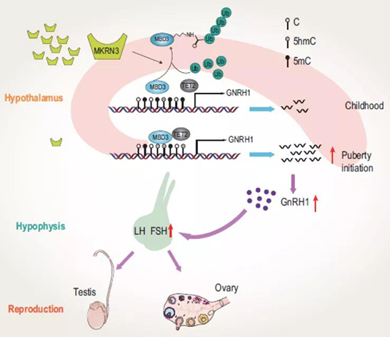 图1. MKRN3-MBD3-TET2调节哺乳动物青春期时间模型