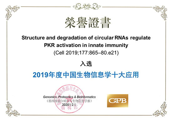 2020年2月,杨力研究组的一项合作研究—“Structure and Degradation of Circular RNAs Regulate PKR Activation in Innate Immunity” (Liu et al, Cell 2019) 成功入选由《基因组蛋白质组与生物信息学报》(Genomics, Proteomics & Bioinformatics) 组织评选的2019年度“中国生物信息学十大应用”。