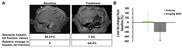 符合入选标准的肥胖食蟹猴接受B1344治疗或对照处理,第69天通过磁共振成像(MRI)测定肝脏脂肪。(A)经每周两次给予2 mg/kg B1344治疗后的猴子肝脏脂肪含量的MRI测量结果;(B)经每周两次给予2 mg/kg B1344治疗后的猴子肝脏脂肪含量的定量测定结果。