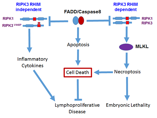 人类自身免疫性淋巴细胞增生综合征(autoimmune lymphoproliferative syndrome,ALPS)是一种淋巴细胞增生为特征的自身免疫性疾病。该疾病的发生是因为淋巴细胞的死亡通路被阻断,导致淋巴细胞的发育稳态被破坏,表现为淋巴结肿大、脾脏肿大、淋巴瘤以及其它自身免疫性疾病的发生。研究人员发现FADD基因敲除小鼠中RIPK3基因V448P突变后小鼠表现为比RIPK3基因敲除更严重的系统性淋巴细胞增生疾病,而通过进一步敲除RIPK1则可以缓解这个疾病的发生。这一意外发现表明RIPK3的RHIM功能结构域不仅在介导细胞程序性坏死信号通路中具有关键作用,而且通过与RIPK1的相互作用在调控淋巴细胞发育及免疫稳态中也发挥重要作用,这些发现为治疗与细胞死亡相关的自身免疫性疾病提供了理论基础和新的靶点。