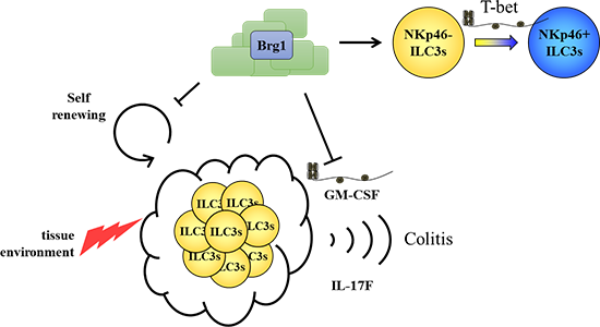 图. Brg1促进NKp46+ILC3s的分化,并通过抑制ILC3表达GM-CSF从而抑制肠道炎症。