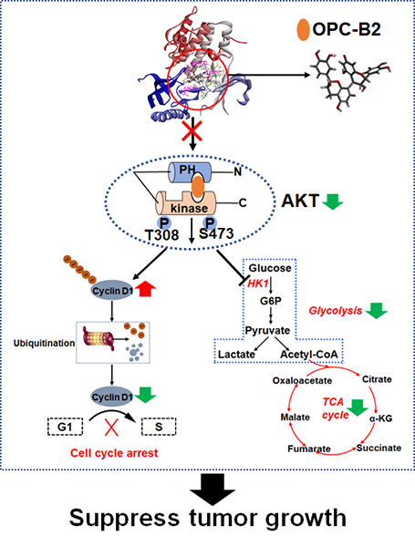OPC-B2是一种具有特殊结构的多酚黄酮类化合物,由两个表儿茶素连接形成,可以从花生红衣、苹果、葡萄等食物中提取。既往的研究发现,原花青素具有非常强的抗氧化与抗炎等多种生物活性:降低胆固醇水平并保护血管内皮细胞免受自由基对血管内皮的损害,从而预防心血管疾病;降低血脂和血糖以及发挥抗肿瘤作用等。本研究发现花生红衣中提取的OPC-B2直接结合并抑制AKT活性和下游信号通路,从而抑制肝癌细胞的增殖、代谢及肿瘤生长。进一步研究发现,与已知的AKT变构抑制剂MK-2206相似,OPC-B2可与AKT的催化结构域及PH结构域结合,从而抑制AKT活性。此外,Lys297和Arg86作为AKT与OPC-B2结合的关键位点,突变后解除了OPC-B2的抗肿瘤作用。该研究首次表明,OPC-B2是一种新型的AKT别构抑制剂,具有显著的抗肿瘤功效。