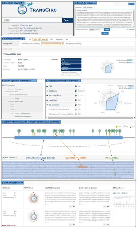 随着测序技术的发展,目前有大量的环形RNA被鉴定出来,与之不匹配的是为数不多的注释数据库,TransCirc就是针对这一需求构建的基于多组学证据的环状RNA翻译数据库。目前,TransCirc中收录了328080条人类环状RNA信息和七类相关证据,其中:1) 核糖体谱(ribosome profiling)鉴定出与核糖体结合的环状RNA共4284条;2) 含实验鉴定的翻译起始位点(TIS)、内部核糖体进入位点(IRES)和N-6-甲基腺苷修饰位点(m6A)的环状RNA分别有10058、314111和40324条;3) 274762条环状RNA含环状RNA特有编码框(ORF),其推断翻译产物中机器学习预测可形成稳定蛋白质和含质谱数据(MS)直接支持的分别有194927和168条。除以上数据外,TransCirc还提供了友好的搜索/浏览界面及辅助分析软件。TransCirc作为研究环状RNA翻译能力及其编码肽段功能的重要资源,未来将收录更多相关组学数据并将扩展覆盖到其他非人物种。
