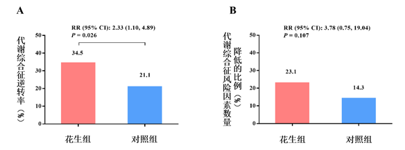 (A)代谢综合征志愿者的代谢综合征逆转率(即干预前符合IDF中国人的标准定义的代谢综合征志愿者在12周干预后不再符合此标准的比例)(花生组,n = 87;对照组,n = 76)。(B)高风险个体的代谢综合征风险因素数量降低的比例(花生组,n = 26;对照组,n = 35)。RR:相对危险度。